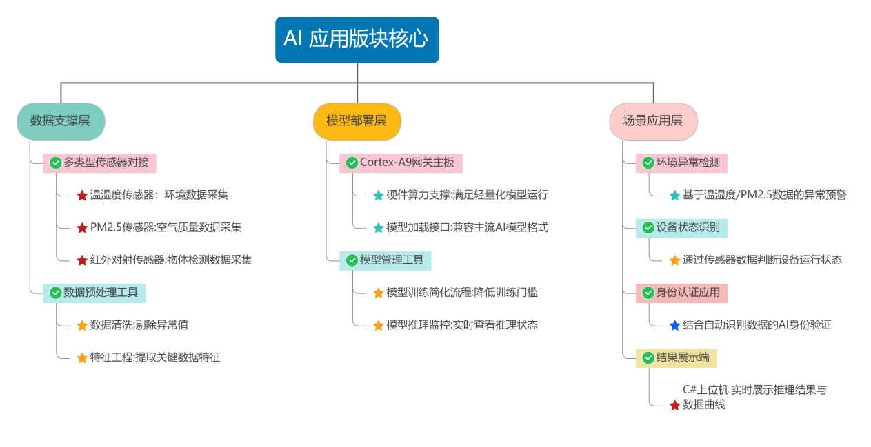 AI 學(xué)習的核心在于 “理論 + 實(shí)踐” 的結合,F-Table 為 AI 應用提供了從數據采集到模型部署的全流程支持。依托平臺豐富的傳感器模塊(如溫濕度、PM2.5、紅外對射傳感器等),學(xué)習者可采集真實(shí)場(chǎng)景數據,用于機器學(xué)習數據集構建;通過(guò)智能網(wǎng)關(guān)系列的 Cortex-A55 網(wǎng)關(guān)主板,可部署輕量化 AI 模型(如環(huán)境異常檢測、設備狀態(tài)識別等),實(shí)現 “邊緣計算 + AI 推理” 的落地實(shí)踐。