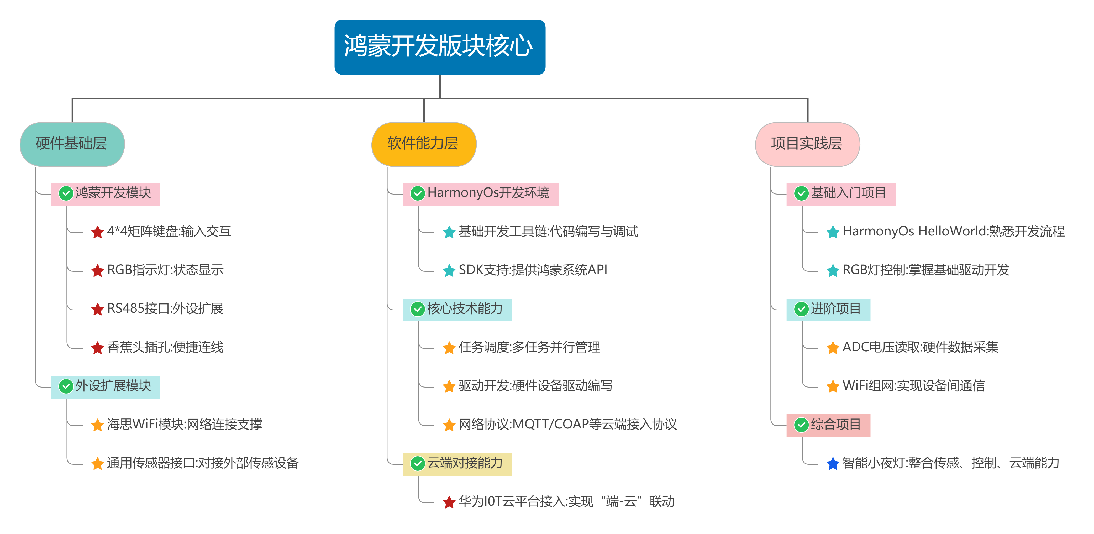 硬件上,鴻蒙開(kāi)發(fā)模塊板載 4*4 矩陣鍵盤(pán)、RGB 指示燈、RS485 接口,關(guān)鍵接口引至香蕉頭插孔,可與其他模塊自由連線(xiàn);軟件上提供從基礎到進(jìn)階的完整實(shí)驗資源,包括 HarmonyOS HelloWorld、任務(wù)調度、驅動(dòng)開(kāi)發(fā)(如 RGB 燈控制、ADC 電壓讀?。?,再到 WiFi 組網(wǎng)、MQTT 協(xié)議接入云端、智能小夜燈綜合項目等。通過(guò)該版塊,學(xué)習者可掌握國產(chǎn)操作系統的開(kāi)發(fā)邏輯,為 AI 與鴻蒙生態(tài)的結合奠定基礎。