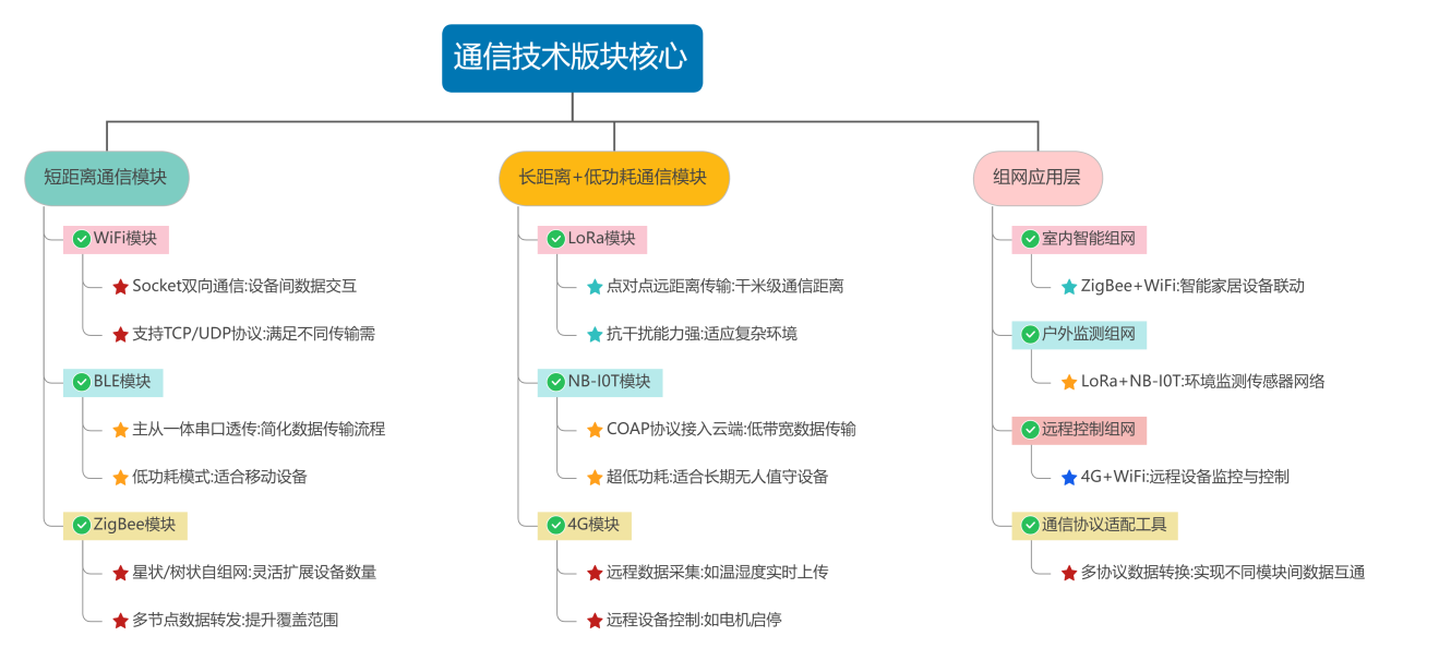 短距離通信:通過(guò) WiFi 模塊實(shí)現 Socket 雙向通信,BLE 模塊完成主從一體串口透傳,ZigBee 模塊搭建星狀 / 樹(shù)狀自組網(wǎng),適用于室內智能場(chǎng)景(如智能家居設備聯(lián)動(dòng));