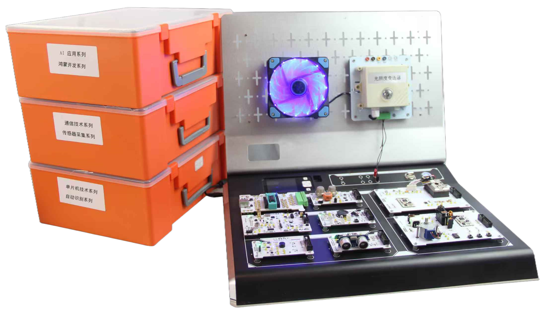 每個(gè)傳感器模塊均支持 Cortex-M3 內核控制,學(xué)習者可通過(guò)實(shí)驗掌握傳感器原理與數據采集方法:例如利用溫濕度傳感器采集環(huán)境數據,通過(guò)折線(xiàn)圖實(shí)時(shí)展示;通過(guò)超聲波傳感器開(kāi)發(fā)倒車(chē)雷達項目;結合稱(chēng)重傳感器實(shí)現重量閾值報警等。這些實(shí)驗不僅為 AI 學(xué)習提供真實(shí)的數據源,更能培養學(xué)習者的 “感知層設計思維”。